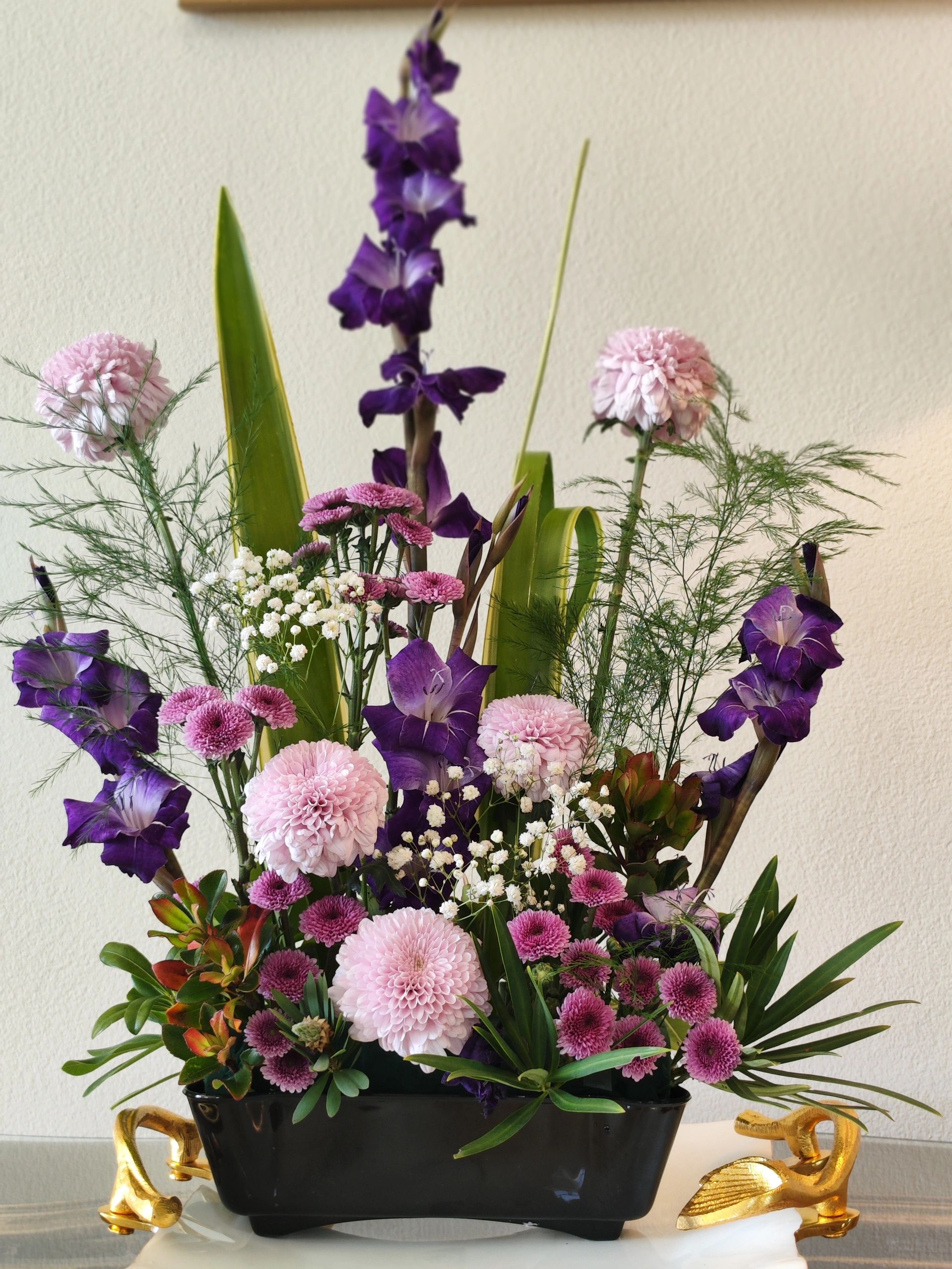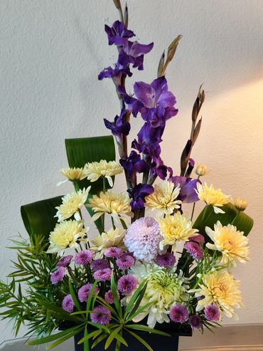 Indulge in the beauty of our Purple Passion flower arrangement, featuring a stunning arrangement of tall purple gladioli and pink flowers in a black vase. Perfect for any occasion.